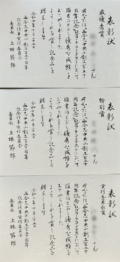 まずは、子ども達のロゴマークコンテスト関係の表彰状と記念品の表書きを、日々のありがたい忙しさの中で、時間を作りながら書かせて頂きました。
