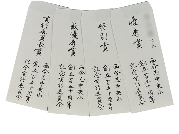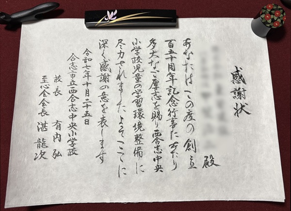 式典に向けてPTA至心会様から、「記念の賞状や感謝状等を、ぜひ和紙に筆文字手書きでお渡したい」とお話がありました。