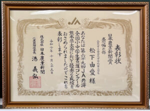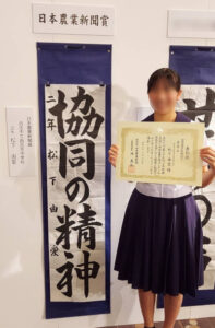 先日もお知らせしましたが、松下由愛さん(西合志中2年)が条幅の部で日本農業新聞賞を受賞されました。